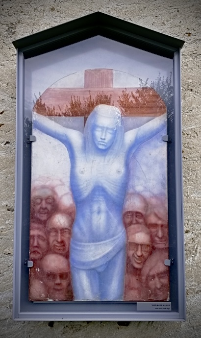 Non meno provocatoria è la seconda opera che rappresenta un Cristo in croce circondato da un insieme di visi dall'aria inquietante, simili a creature degli inferi accalcate le une sulle altre. L'idea al contempo provocatoria e geniale di Giger fu ritrarre in quei visi abitanti reali di S. Abbondio. Si può solo immaginare il passa parola infernale generato in paese...